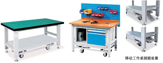在重型工作臺的基礎上設計增加了腳踏裝置,只要一腳就解決了重型工作臺笨重移動不方便的缺點,靜載承重可達1噸,適用于車間、倉庫、實驗室等處。